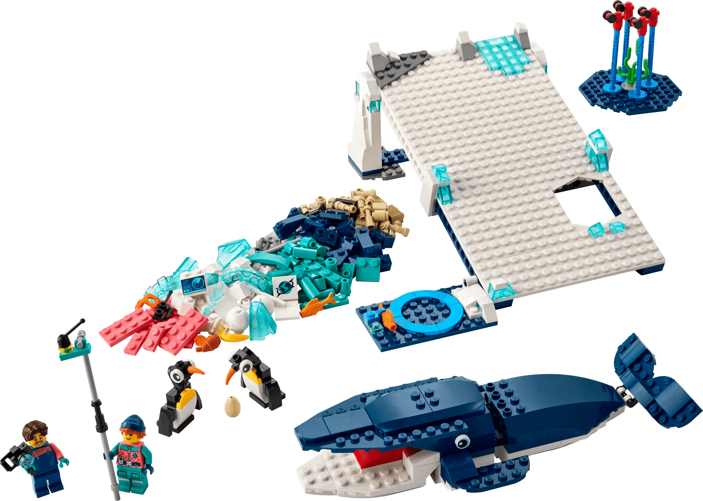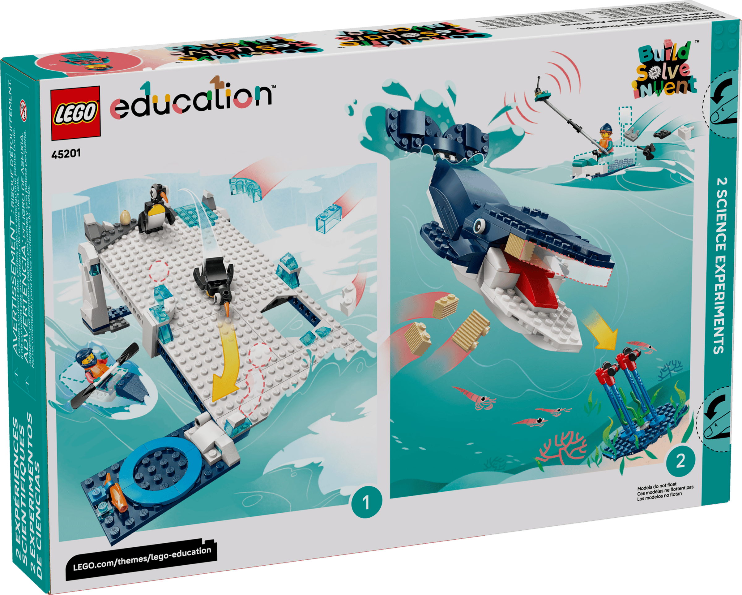 در ست لگو اجوکیشن ۴۵۲۰۱، آزمایشهای علوم زیستی به شکلی ساده اما هدفمند ارائه شدهاند. پنگوئنها میتوانند از شیب یخی سر بخورند و وارد حفره شوند، نهنگ با مفاصل متحرک امکان بررسی حرکت را فراهم میکند و کریلها از میلههای معلق جدا میشوند. مینیفیگورهای دانشمند هرکدام دو حالت چهره دارند که به تعامل بیشتر در حین فعالیت کمک میکند. همچنین ابزارهایی مانند دوربین و چوب دارای ردیاب جداشونده، فضای آموزشی قطب جنوب را در این ست تکمیل میکنند و به کودکان اجازه میدهند سناریوهای مختلف علمی را بازسازی کنند.