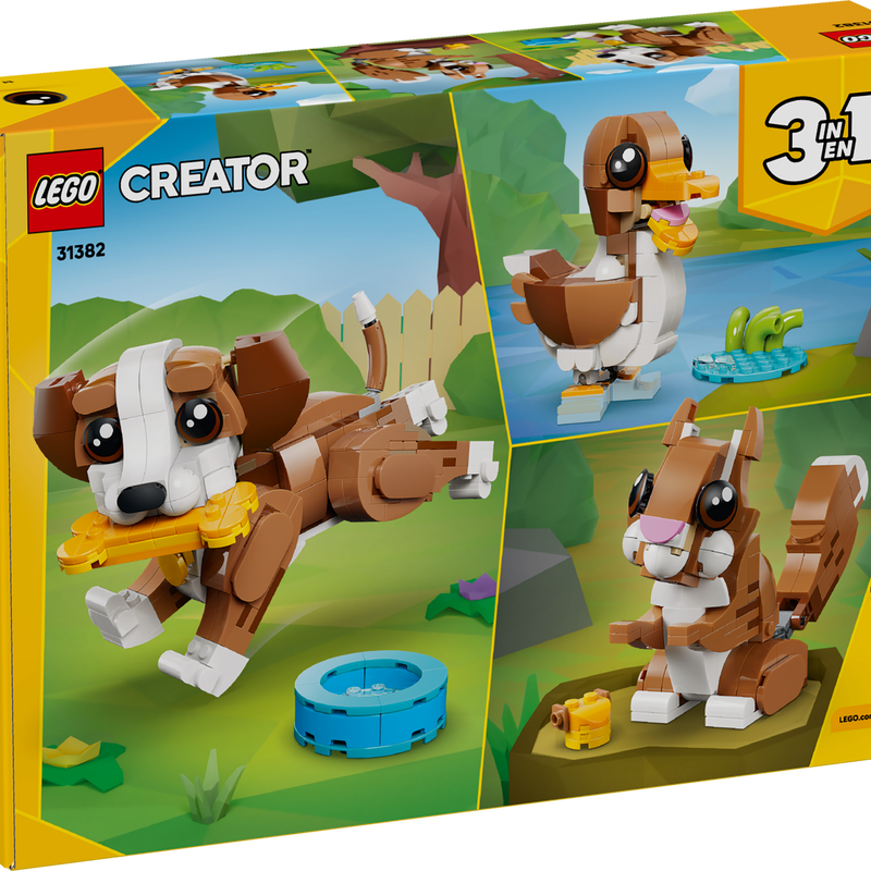 ست لگو سگ بازیگوش ۳۱۳۸۲ از سری لگو کریتور ۳ در ۱، با تمرکز بر حیوانات طراحی شده و امکان ساخت سه مدل متفاوت را با قطعات این ست فراهم می‌کند. در این ست می‌توان یک سگ را با جزئیات حرکتی کامل ساخت و سپس همان قطعات را برای ساخت سنجاب یا اردک استفاده کرد.
