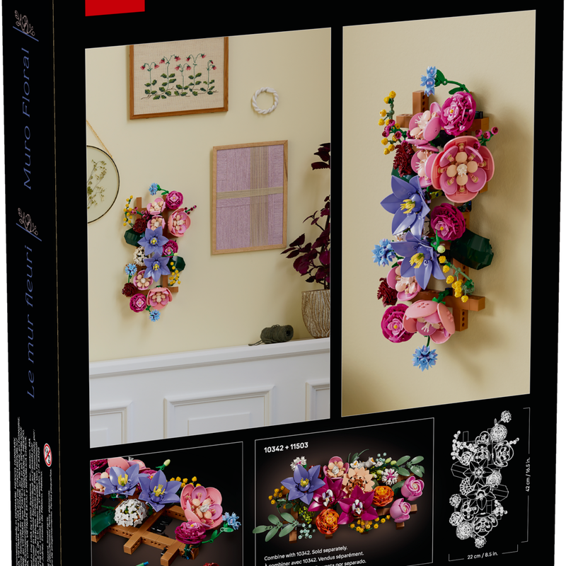 تجربه‌ی ساخت ست لگو دیوار گل ۱۱۵۰۳ بر پایه‌ی آزادی در طراحی شکل گرفته است. ابتدا فریم دیواری ساخته می‌شود و سپس گل‌ها روی آن قرار می‌گیرند. ترکیب گل‌ها کاملاً قابل تغییر است و شما می‌توانید آن‌ها را مطابق سلیقه‌ی شخصی خود بچینید. گل‌های موجود در این ست شامل دو گل کاملیا بزرگ، سه کاملیا کوچک، دو گل کلماتیس، سه گل رانانکولوس، دو رز قرمز تیره، یک هورتانسیا، سه گل گندم‌گل، دو شاخه میموزا، دو شاخه واکس‌فلاور و دو برگ بزرگ هستند. این تنوع باعث می‌شود نتیجه‌ی نهایی ظاهری پویا و طبیعی داشته باشد. پس از اتمام ساخت، دیوار گل به یک دیسپلی مدل تزئینی تبدیل می‌شود که می‌توان آن را به‌صورت افقی، عمودی یا حتی با زاویه نمایش داد.